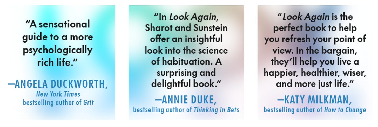 Look Again explores how our brains stop noticing whatâs familiarâpeople, pleasures, routinesâand how that automatic process (called habituation) can dull joy, motivation, and awareness. The authors, a neuroscientist and a behavioral economist, explain how this adaptation helps us survive but can also make us disengage from what once mattered.